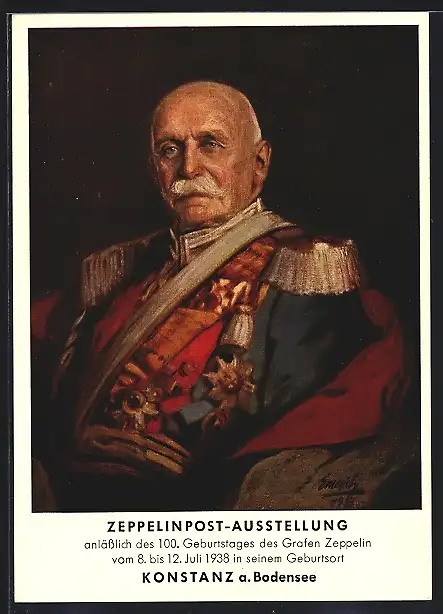 AK Konstanz, Zeppelinpost-Ausstellung, Portrait des Grafen Zeppelin in Uniform, zum 100. Geburtstag, im Juli 1938