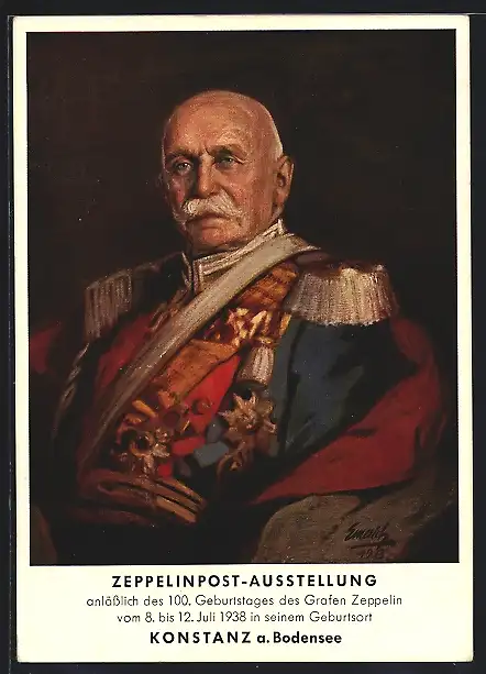 AK Konstanz, Zeppelinpost-Ausstellung, Portrait des Grafen Zeppelin in Uniform, zum 100. Geburtstag, im Juli 1938