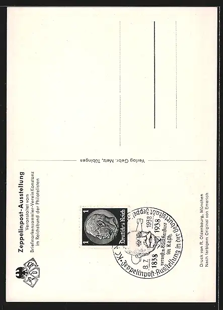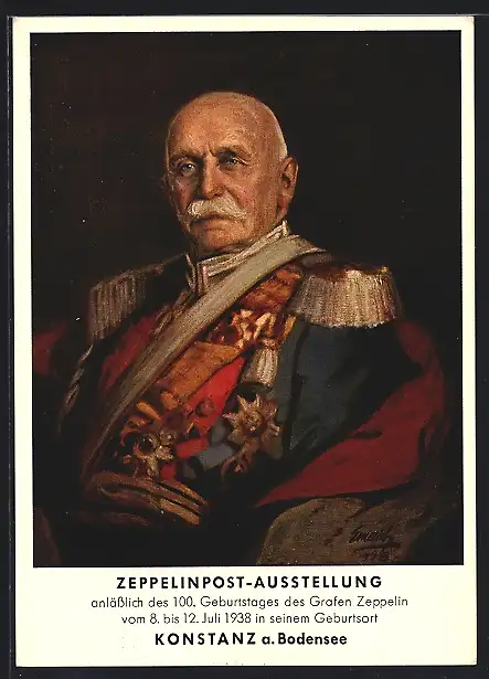 AK Konstanz, Zeppelinpost-Ausstellung, Portrait des Grafen Zeppelin in Uniform, zum 100. Geburtstag, im Juli 1938