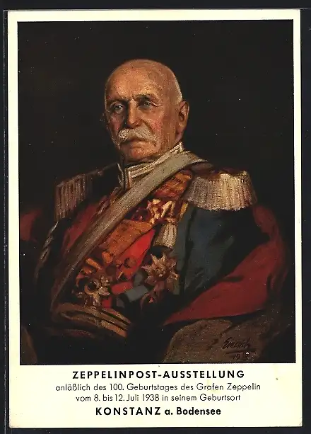 AK Konstanz, Zeppelinpost-Ausstellung, Portrait des Grafen Zeppelin in Uniform, zum 100. Geburtstag, im Juli 1938