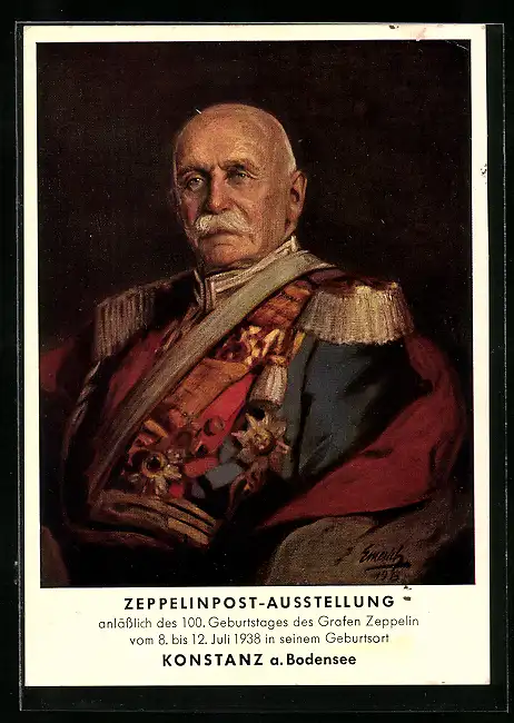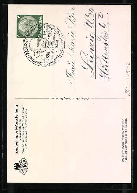 AK Konstanz, Zeppelinpost-Ausstellung anlässlich des 100. Geburtstages des Grafen Zeppelin, Juli 1938, Ganzsache