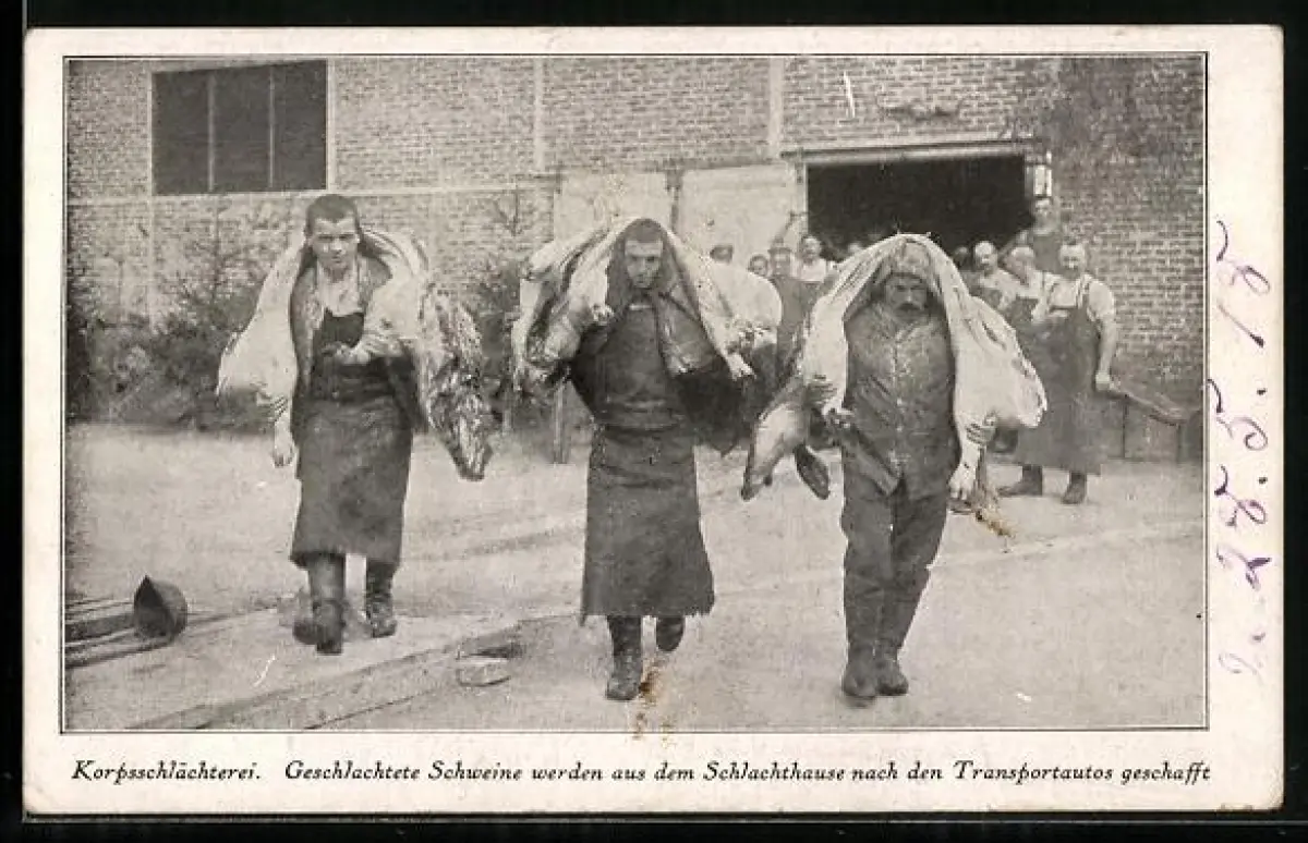 AK Korpsschlächterei, Fleischer tragen geschlachtete Schweine nach den Transportautos