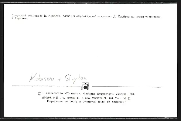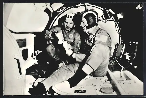 AK Kosmonaut Kubasow und Astronaut Slayton in einer Raumkapsel, Raumfahrt