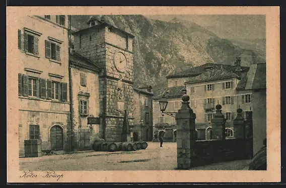 AK Kotor, Ortspartie mit Fässern auf der Strasse