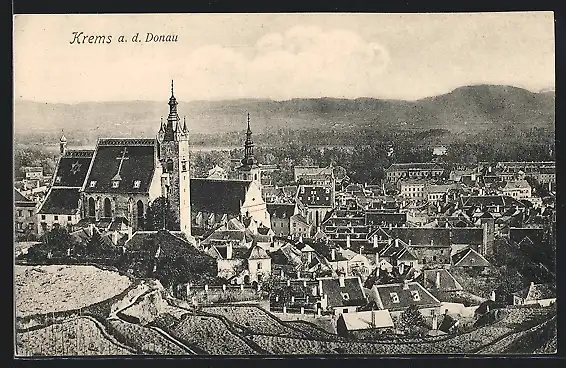 AK Krems a. d. Donau, Ortsansicht mit Kirche aus der Vogelschau