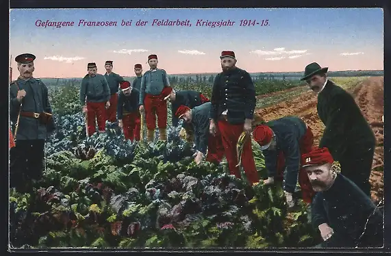 AK Kriegsgefangene Soldaten in Uniform bei der Feldarbeit, Kriegsjahr 1914-15