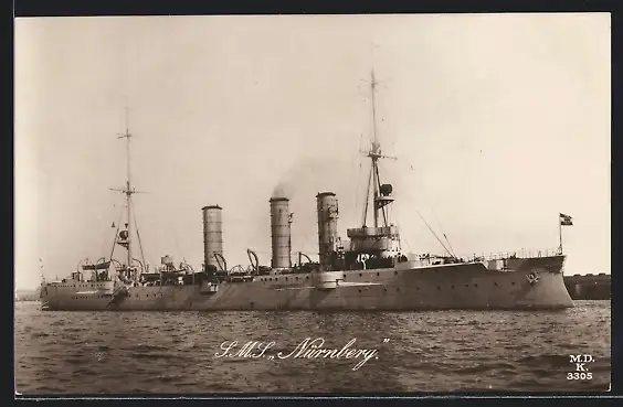 AK Kriegsschiff S.M.S. Nürnberg vom Ostasiengeschwader vor einer Küste