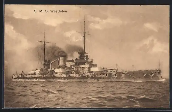 AK Kriegsschiff SMS Westfalen unter Volldampf