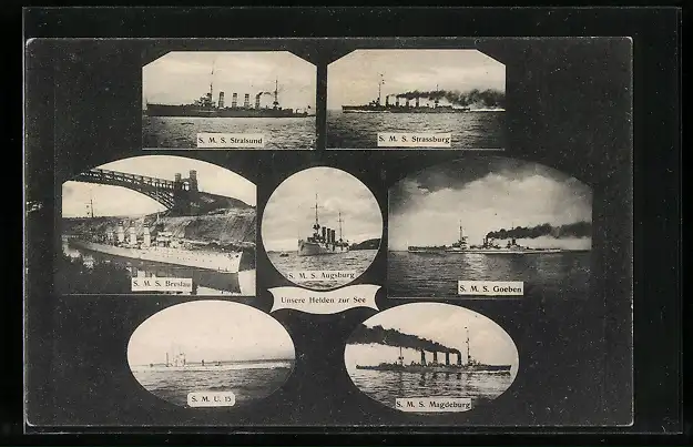 AK Kriegsschiffe SMS Stralsund, Strassburg, Breslau, U-Boot SM U. 15