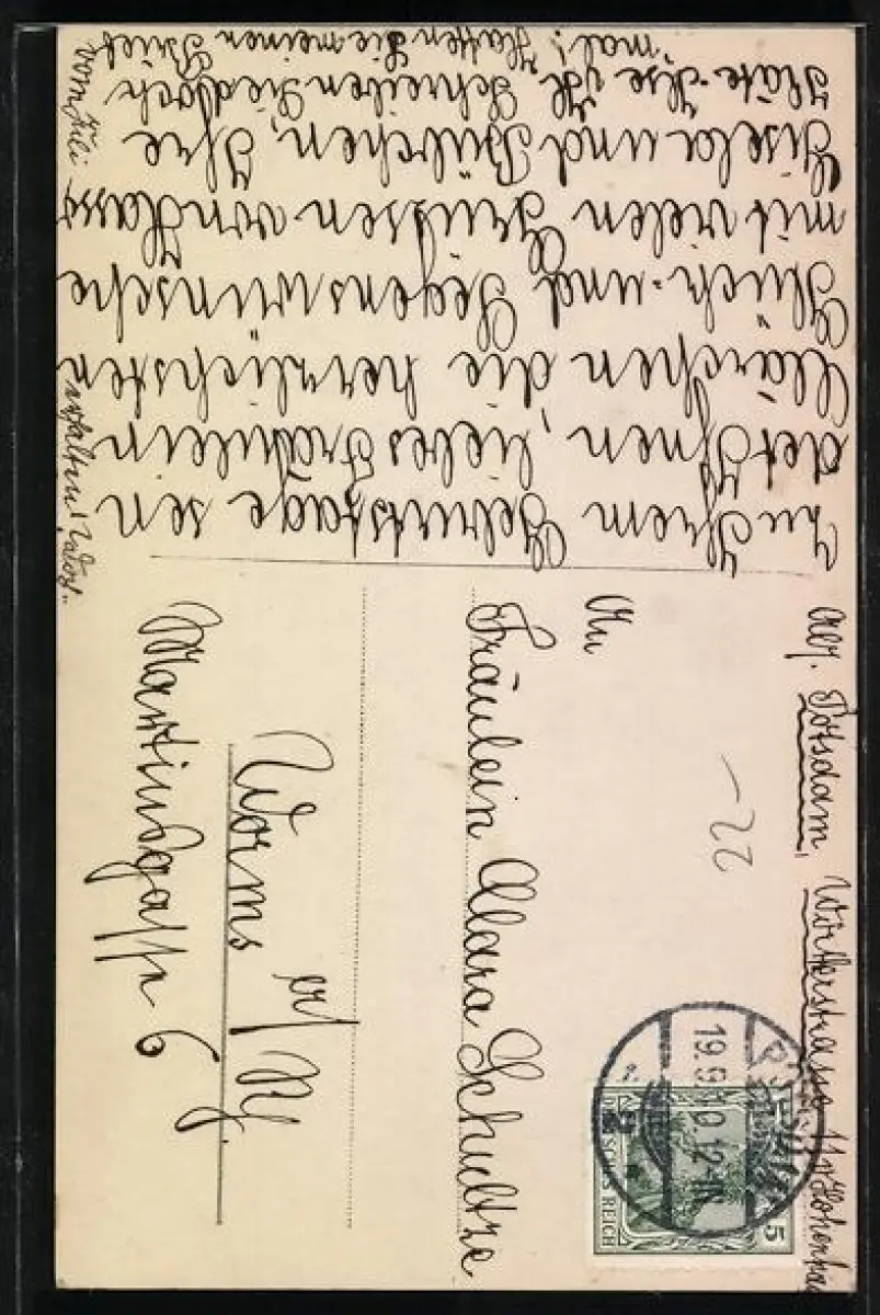 Personenbezogene Daten auf der Rückseite der Karte wurden durch blauen Textmarker unkenntlich gemacht. Die blauen Stellen sind auf die Vorderseite durchgeweicht und wirken sich negativ auf das Postkartenfoto aus