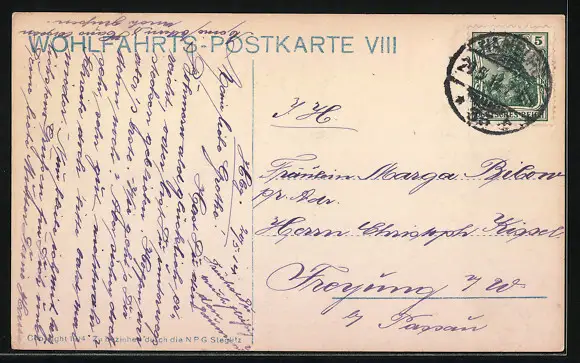 Personenbezogene Daten auf der Rückseite der Karte wurden durch blauen Textmarker unkenntlich gemacht. Die blauen Stellen sind auf die Vorderseite durchgeweicht und wirken sich negativ auf das Postkartenfoto aus