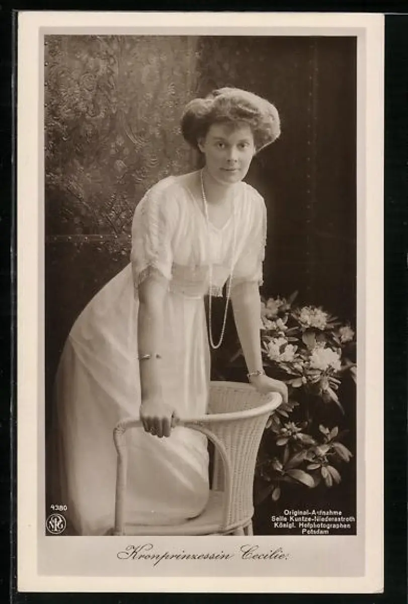 AK Kronprinzessin Cecilie stützt sich auf einen Stuhl