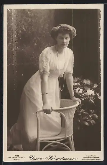 AK Kronprinzessin Cecilie von Preussen mit Schmuck beugt sich über einen Stuhl