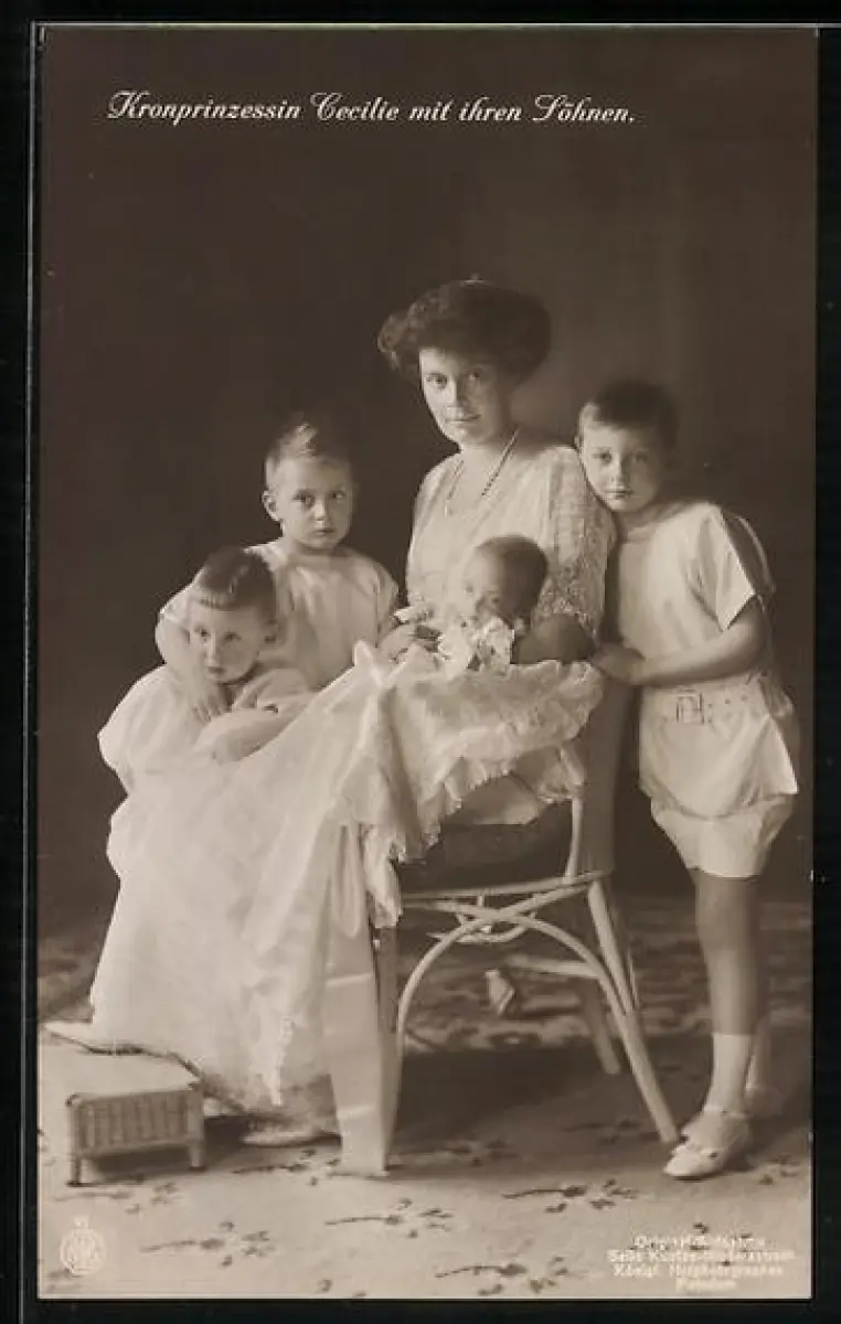 AK Kronprinzessin Cecilie von Preussen sitzt auf einem Stuhl im kreise ihrer vier Söhne