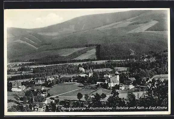 AK Krummhübel /Riesengebirge, Talblick mit Kath. u. Evgl. Kirche