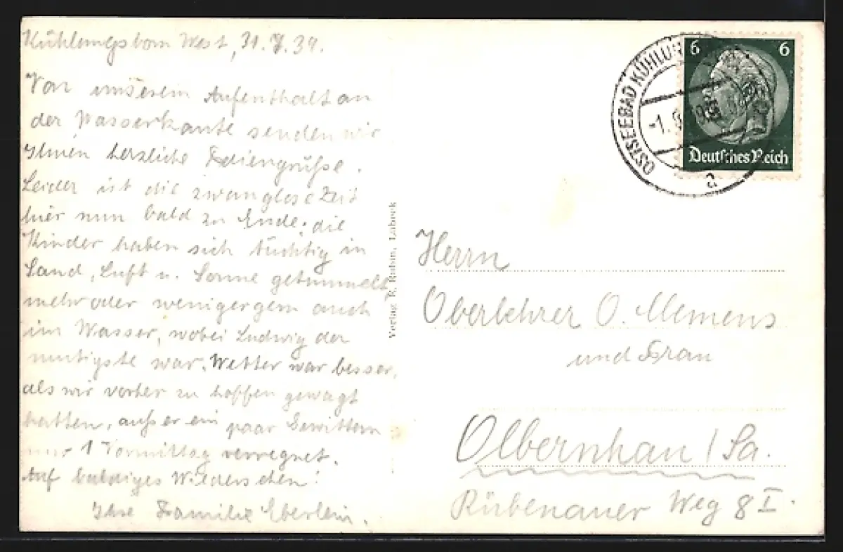Personenbezogene Daten auf der Rückseite der Karte wurden durch blauen Textmarker unkenntlich gemacht. Die blauen Stellen sind auf die Vorderseite durchgeweicht und wirken sich negativ auf das Postkartenfoto aus