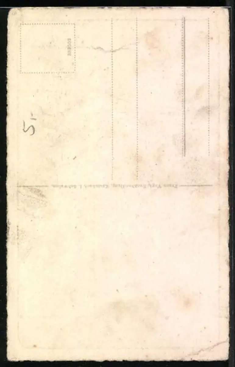 Personenbezogene Daten auf der Rückseite der Karte wurden durch blauen Textmarker unkenntlich gemacht. Die blauen Stellen sind auf die Vorderseite durchgeweicht und wirken sich negativ auf das Postkartenfoto aus