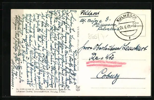 Personenbezogene Daten auf der Rückseite der Karte wurden durch blauen Textmarker unkenntlich gemacht. Die blauen Stellen sind auf die Vorderseite durchgeweicht und wirken sich negativ auf das Postkartenfoto aus