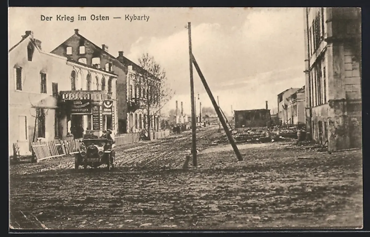 AK Kybarty, Der Krieg im Osten, Strassenpartie mit Geschäften