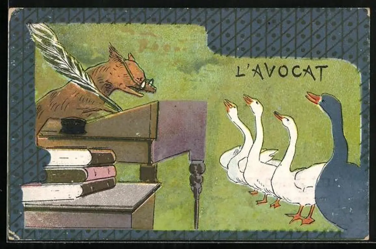 AK L`Avocat, Fuchs am Pult vor Gänsen, vermenschlichte Tiere