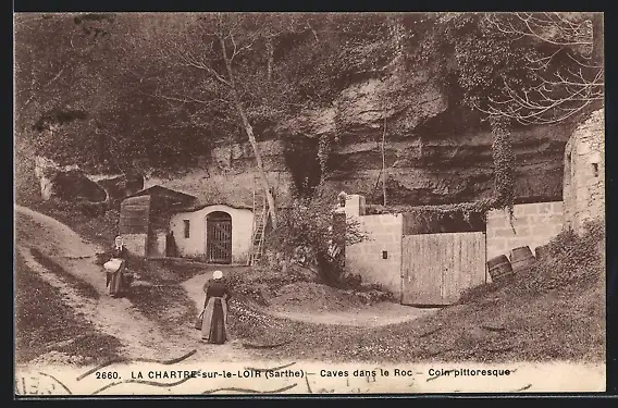 AK La Chartre sur le Loir, Caves dans le roc avec femmes devant