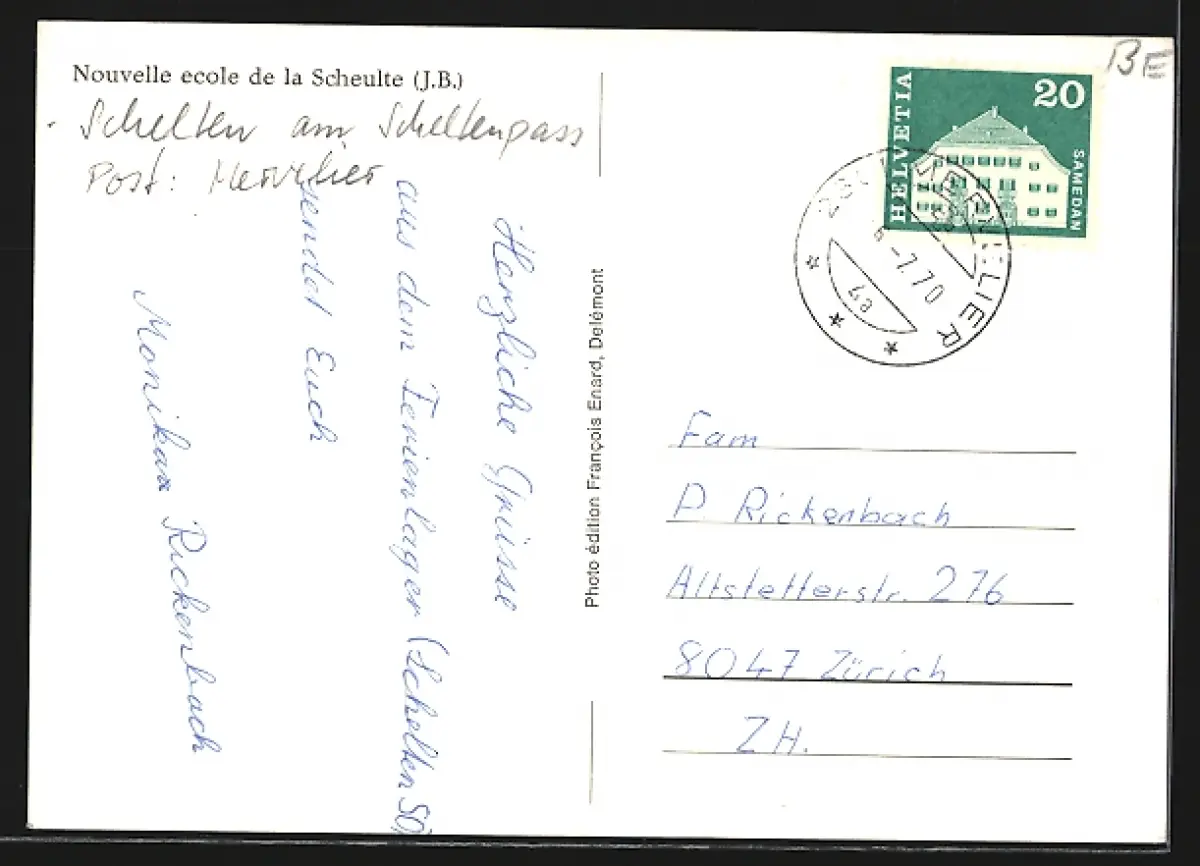 Personenbezogene Daten auf der Rückseite der Karte wurden durch blauen Textmarker unkenntlich gemacht. Die blauen Stellen sind auf die Vorderseite durchgeweicht und wirken sich negativ auf das Postkartenfoto aus