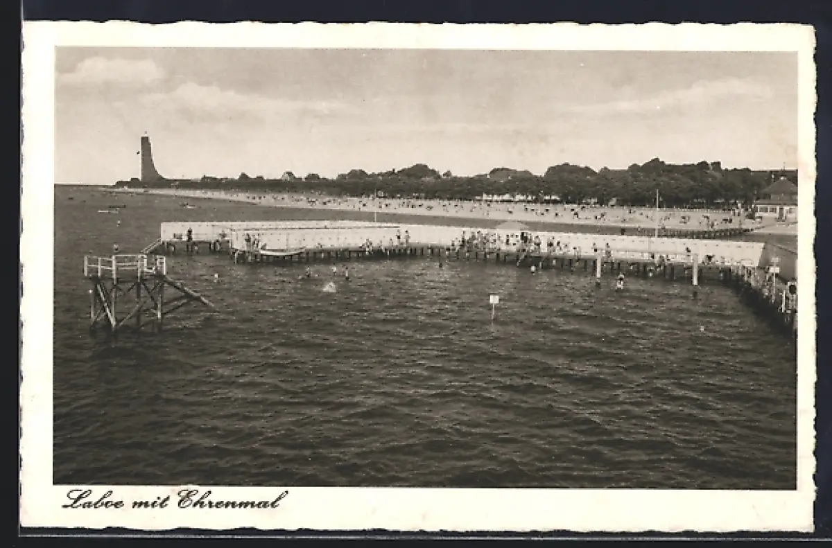 AK Laboe, Blick vom Schwimmbad zum Ehrenmal