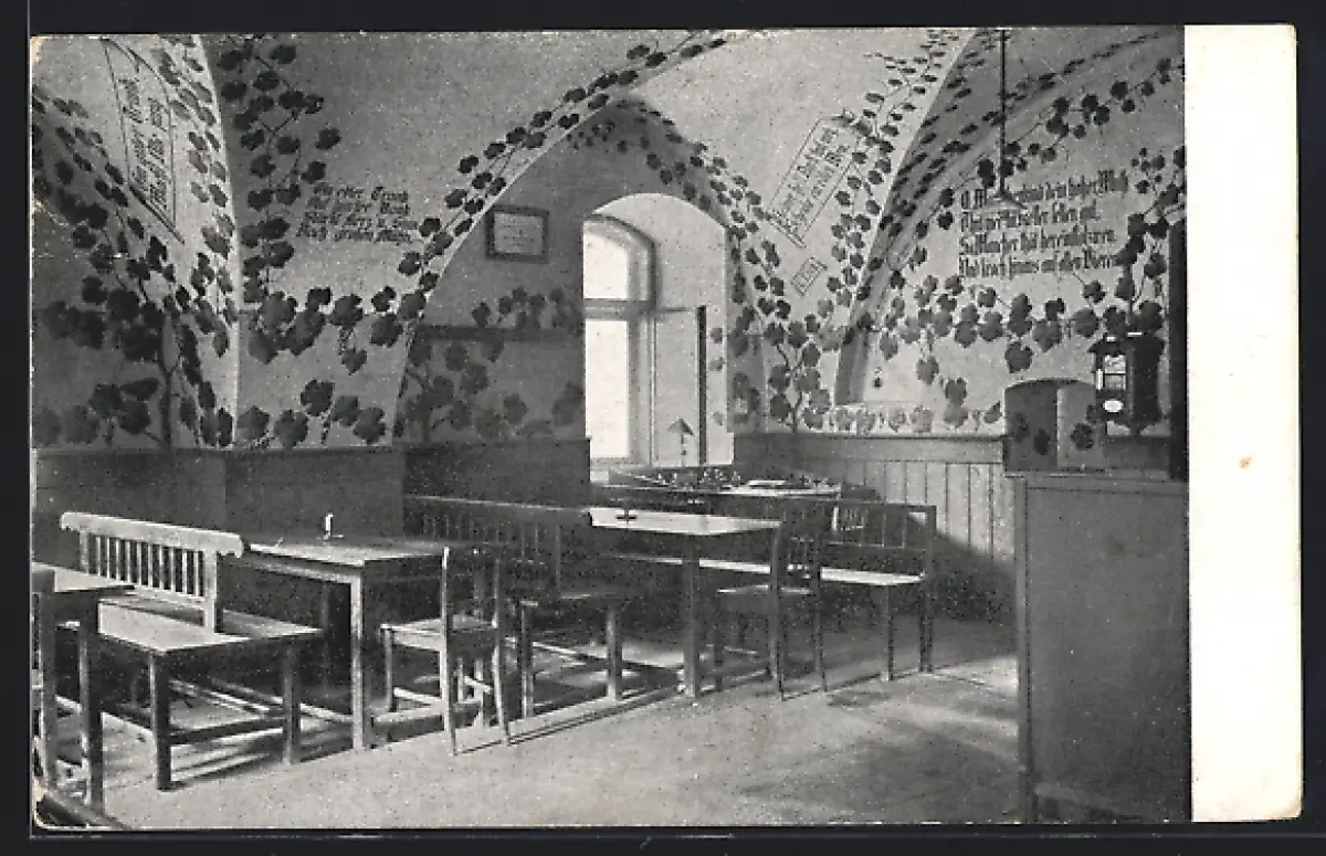 AK Lambach, Stifts-Weinstübl, Innenansicht mit Weinranken und Sprüchen