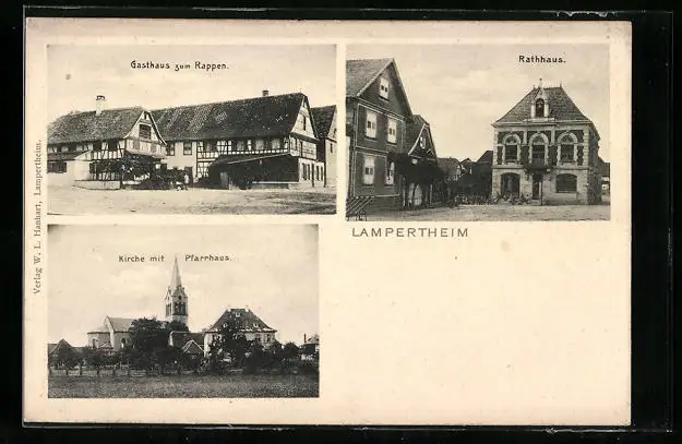 AK Lampertheim, Gasthaus zum Rappen, Rathaus, Kirche mit Pfarrhaus