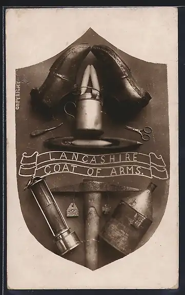 AK Lancashire, Coat of Arms, Bergbau-Wappen mit Hacke und Grubenlicht