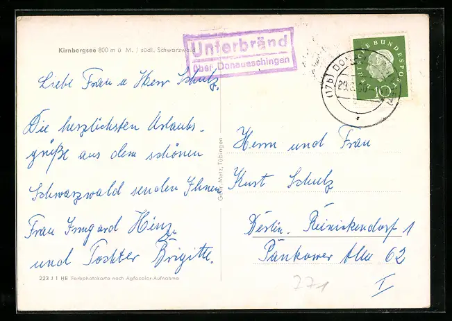 AK Landpoststempel Unterbränd über Dnaueschingen