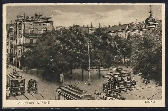 AK Landsberg /Warthe, Markt mit Strassenbahnen