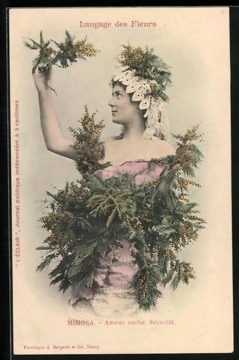 AK Langage des Fleurs, Blumensprache, Mimosa, Amour caché, Sécurité, Mädchen mit Mimosenstrauss