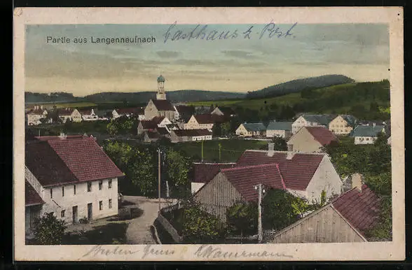 Personenbezogene Daten auf der Rückseite der Karte wurden durch blauen Textmarker unkenntlich gemacht. Die blauen Stellen sind auf die Vorderseite durchgeweicht und wirken sich negativ auf das Postkartenfoto aus