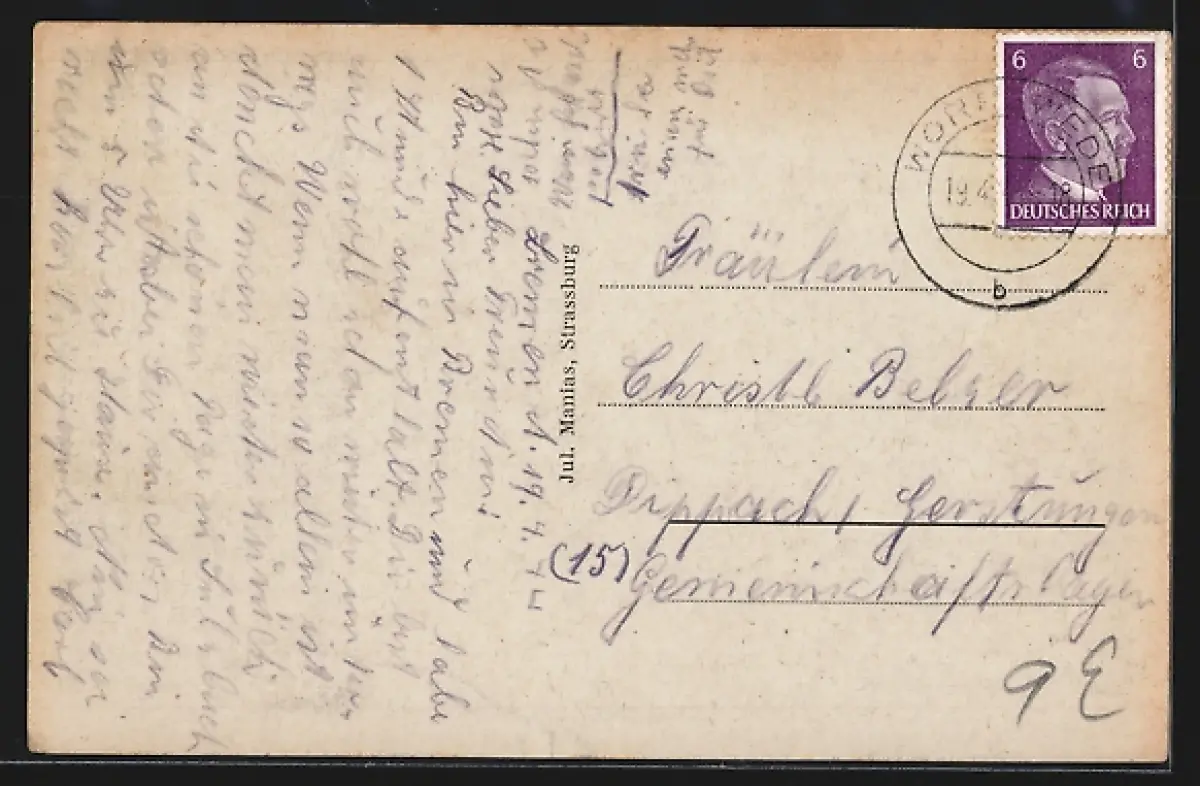 Personenbezogene Daten auf der Rückseite der Karte wurden durch blauen Textmarker unkenntlich gemacht. Die blauen Stellen sind auf die Vorderseite durchgeweicht und wirken sich negativ auf das Postkartenfoto aus