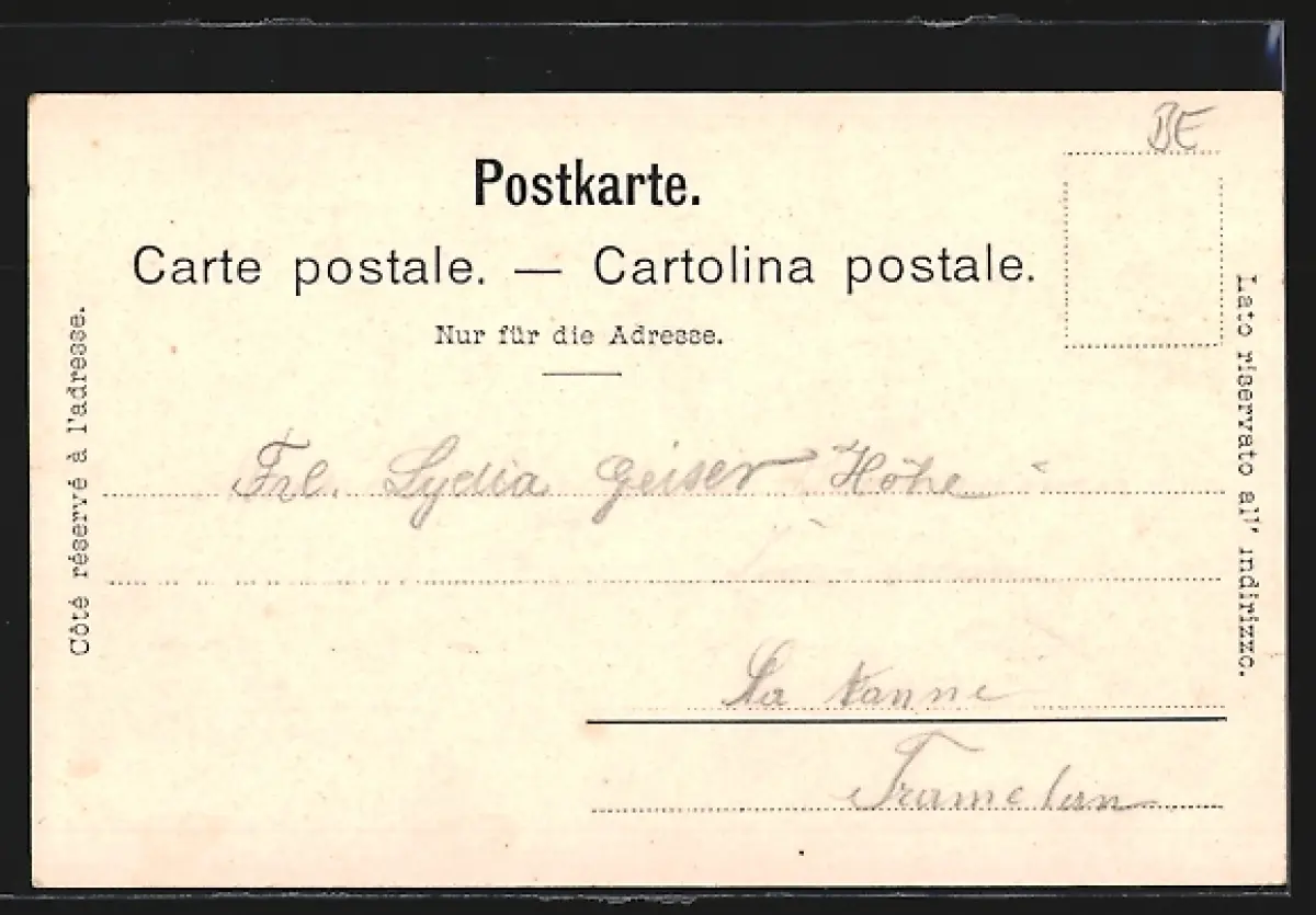 Personenbezogene Daten auf der Rückseite der Karte wurden durch blauen Textmarker unkenntlich gemacht. Die blauen Stellen sind auf die Vorderseite durchgeweicht und wirken sich negativ auf das Postkartenfoto aus