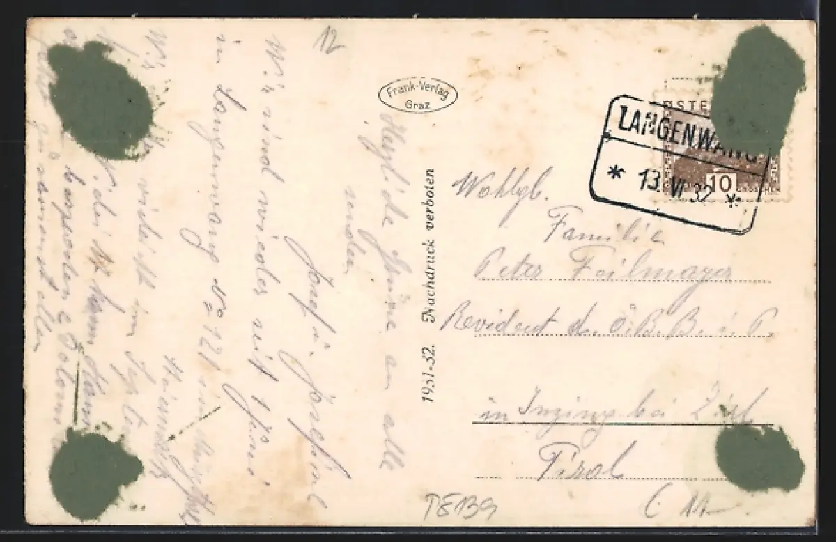 gelaufen 1932, rückseitig Klebe- und Papierreste, Eckknick rechts unten, sonst guter Zustand