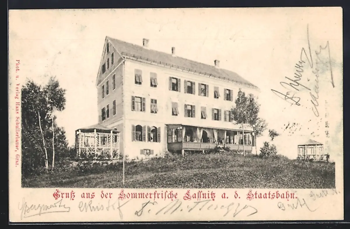 AK Lassnitz a. d. Staatsbahn, Grosses Haus mit Veranda und Pavillon
