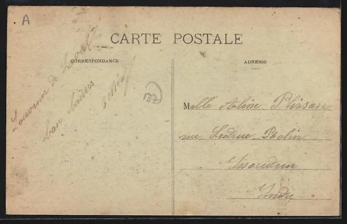 Personenbezogene Daten auf der Rückseite der Karte wurden durch blauen Textmarker unkenntlich gemacht. Die blauen Stellen sind auf die Vorderseite durchgeweicht und wirken sich negativ auf das Postkartenfoto aus