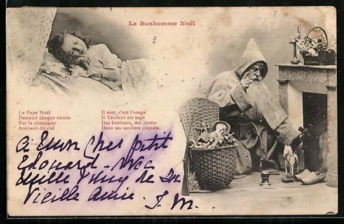 AK Le Bonhomme Noel, Weihnachtsmann platziert Geschenke