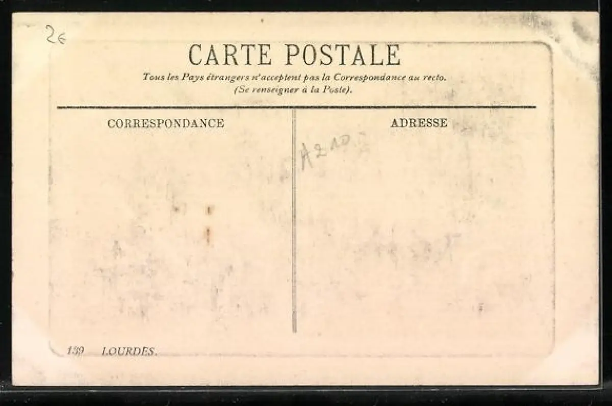 Personenbezogene Daten auf der Rückseite der Karte wurden durch blauen Textmarker unkenntlich gemacht. Die blauen Stellen sind auf die Vorderseite durchgeweicht und wirken sich negativ auf das Postkartenfoto aus
