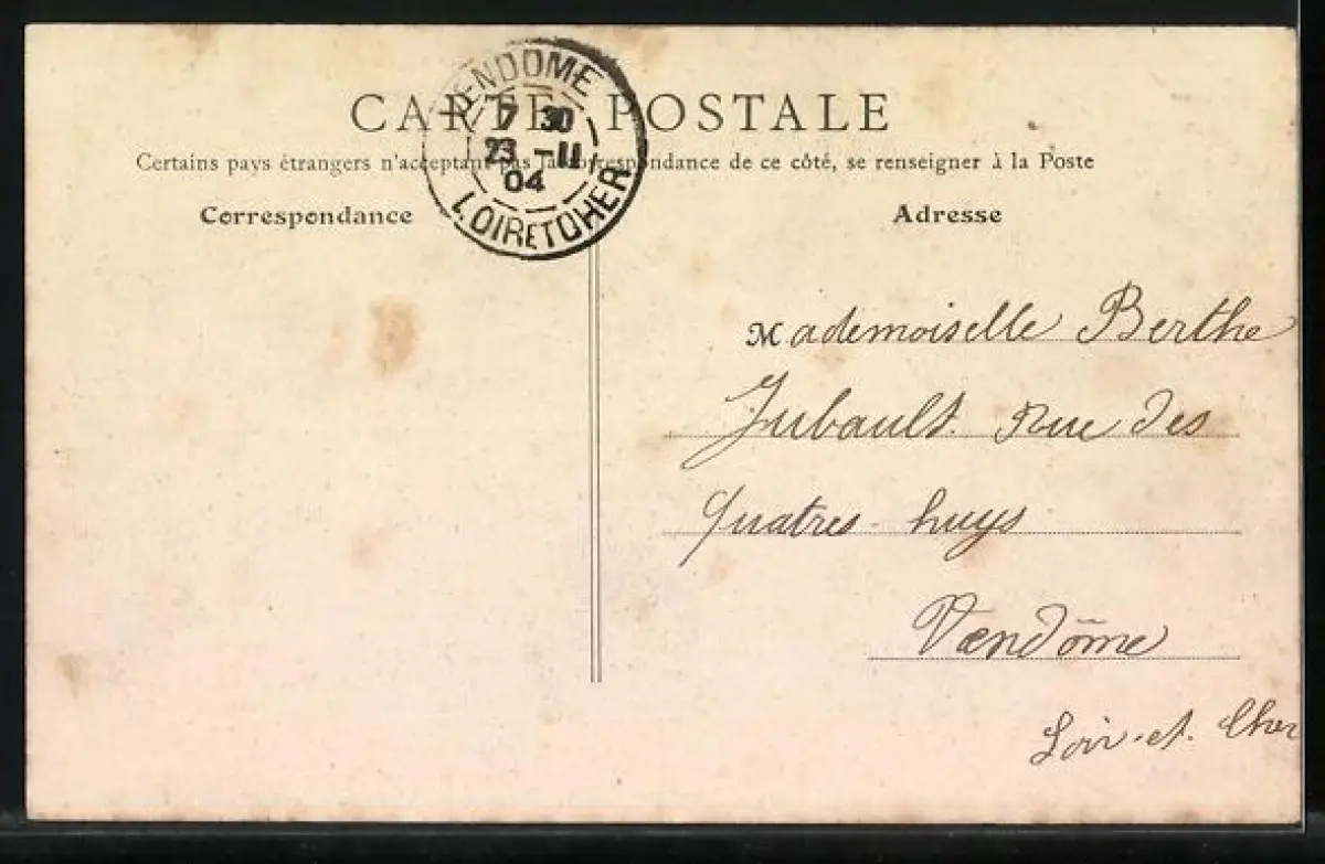Personenbezogene Daten auf der Rückseite der Karte wurden durch blauen Textmarker unkenntlich gemacht. Die blauen Stellen sind auf die Vorderseite durchgeweicht und wirken sich negativ auf das Postkartenfoto aus