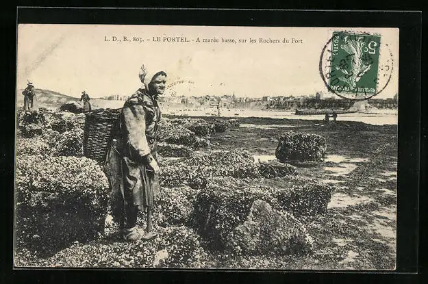 AK Le Portel, A marée basse, sur les Rochers du Fort