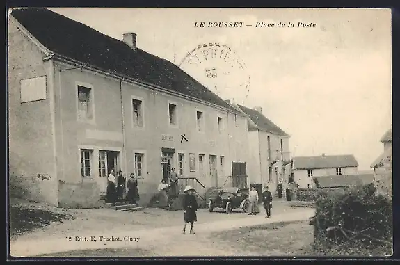 AK Le Rousset, Place de la Poste avec habitants et voiture devant le bâtiment