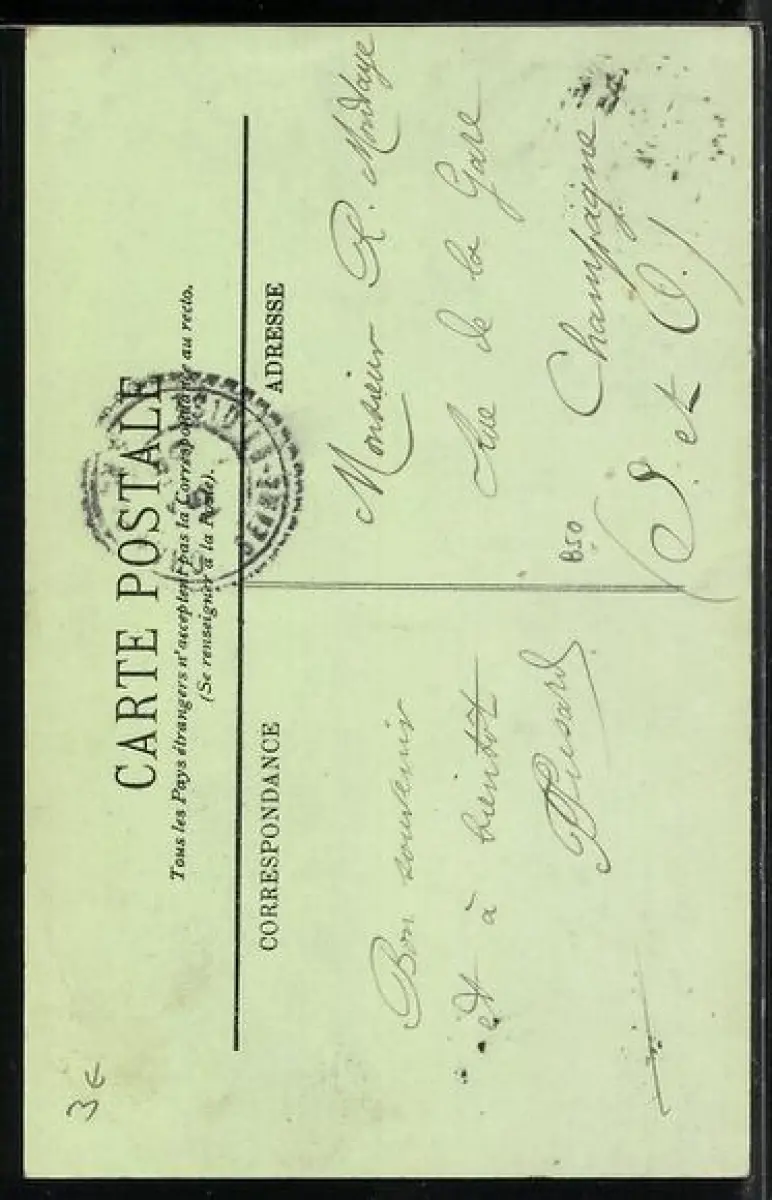 Personenbezogene Daten auf der Rückseite der Karte wurden durch blauen Textmarker unkenntlich gemacht. Die blauen Stellen sind auf die Vorderseite durchgeweicht und wirken sich negativ auf das Postkartenfoto aus
