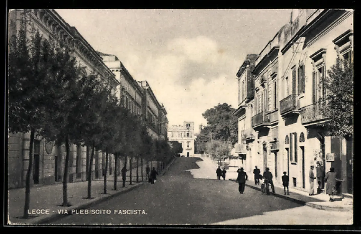AK Lecce, Via Plebiscito Fascista con edifici storici e passanti