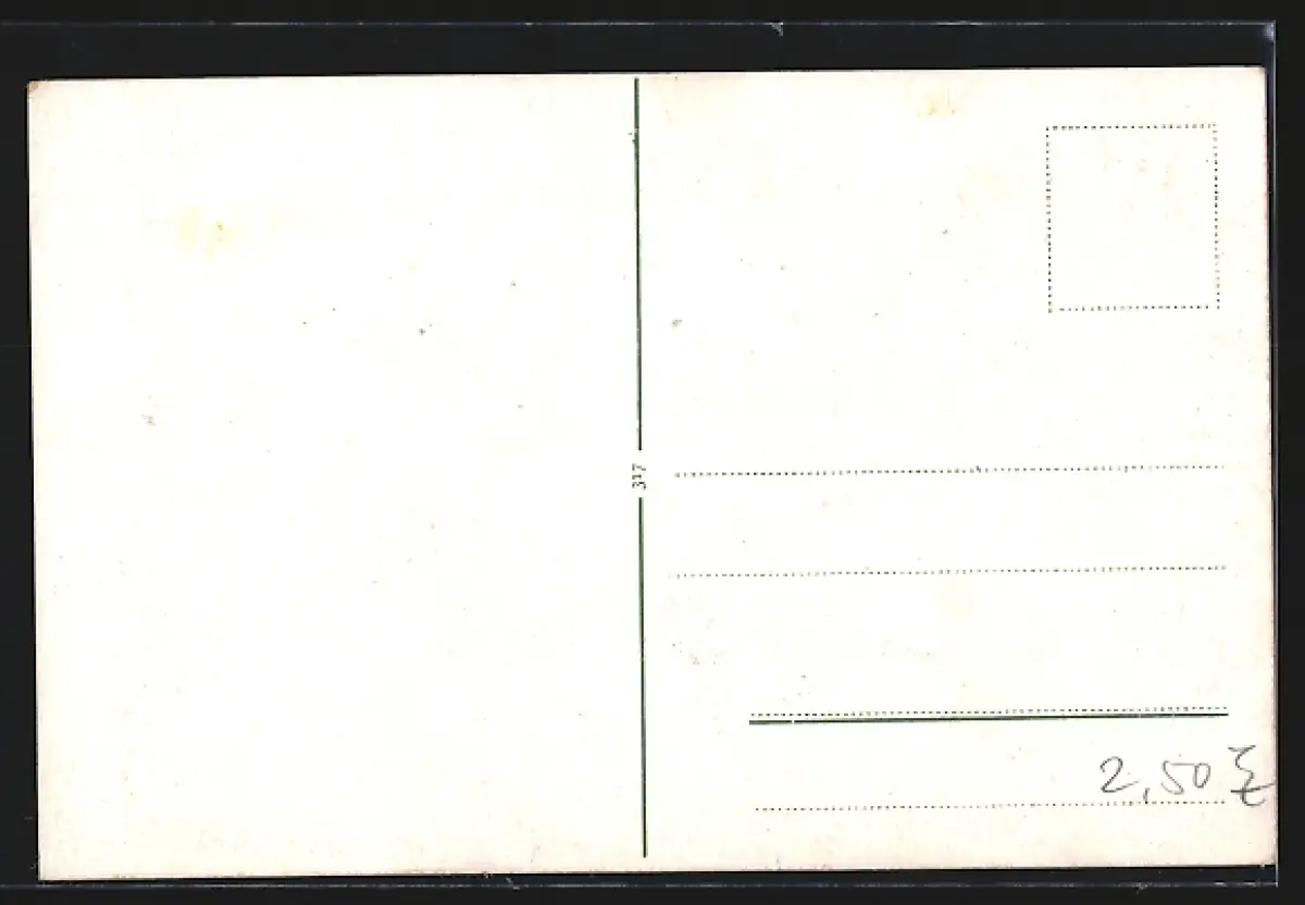 Personenbezogene Daten auf der Rückseite der Karte wurden durch blauen Textmarker unkenntlich gemacht. Die blauen Stellen sind auf die Vorderseite durchgeweicht und wirken sich negativ auf das Postkartenfoto aus