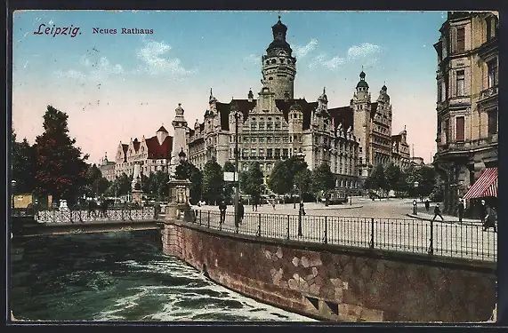 AK Leipzig, Flusspartie mit neuem Rathaus und Strassenbahn