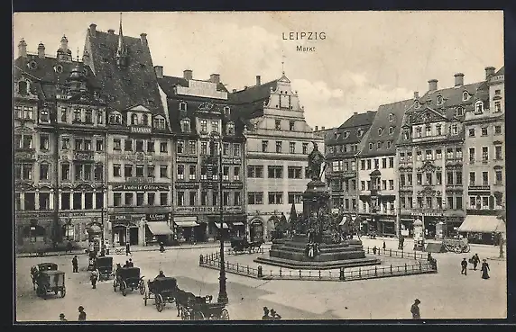 AK Leipzig, Markt mit Geschäften und Denkmal