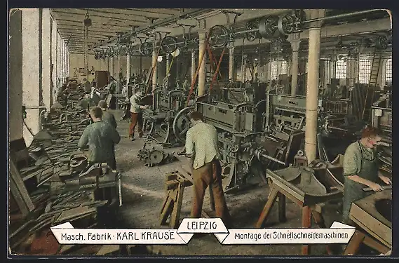 AK Leipzig, Maschinenfabrik Karl Krause, Montage der Schnellschneidemaschinen, Fabrikarbeiter